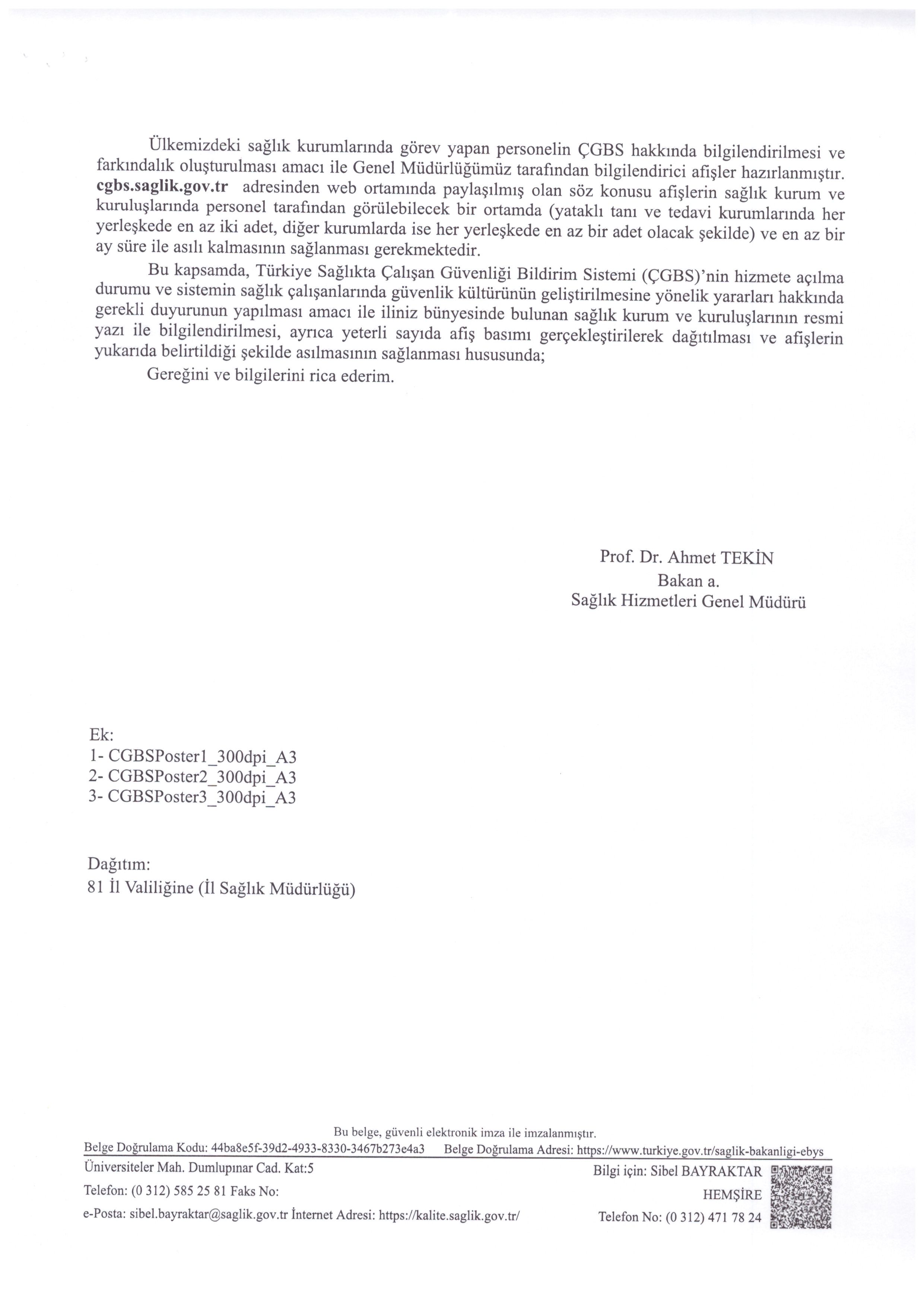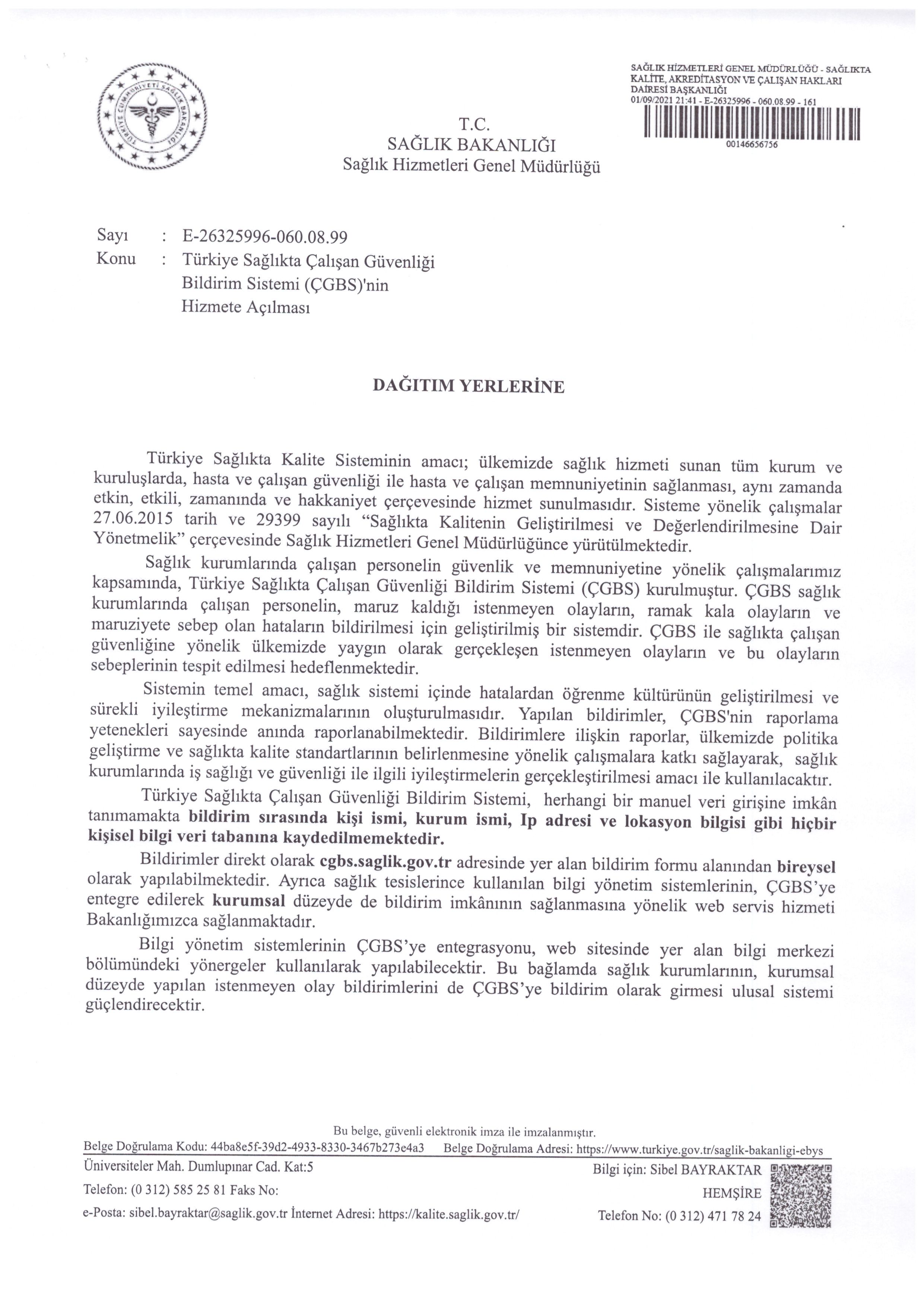 TÜRKİYE SAĞLIKTA ÇALIŞAN GÜVENLİĞİ BİLDİRİM SİSTEMİ (ÇGBS)'NİN HİZMETE AÇILMASI